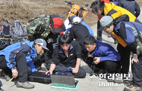 ▲산악인들은 지난 2004년 9월부터 5년째 한라산 옛길 찾기에 나서고 있다. 산악계 숲길조사팀이 GPS로 측정한 자료를 노트북에 입력시키고 있다. /사진=강경민기자