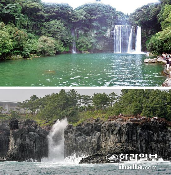 ▲사진 위로부터 세계지질공원 후보지인 천지연폭포·지삿개 주상절리. /사진=한라일보DB