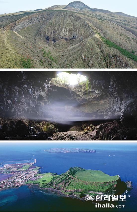 ▲사진 위로부터 세계지질공원 후보지인 한라산·만장굴·성산일출봉. /사진=한라일보DB