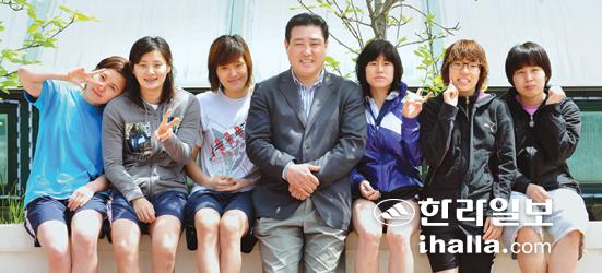 ▲최인호 감독(사진 가운데)이 17일 제주시 외도수영장에서 훈련에 앞서 잠시 짬을 내 자신이 지도하는 제주시청 수영부 선수들과 포즈를 취했다. /사진=이승철기자