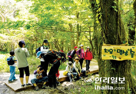 ▲사려니 숲길의 중앙부분에 위치해 있는 치유와 명상의 숲길인 '월든'이 산림욕 장소로 탐방객들로부터 각광을 받고 있다. /사진=강경민기자
