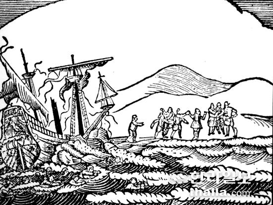 ▲1668년 암스테르당 스티히터 판의 `하멜표류기`에 실린 스페르웨르호 난파 장면을 담은 삽화.