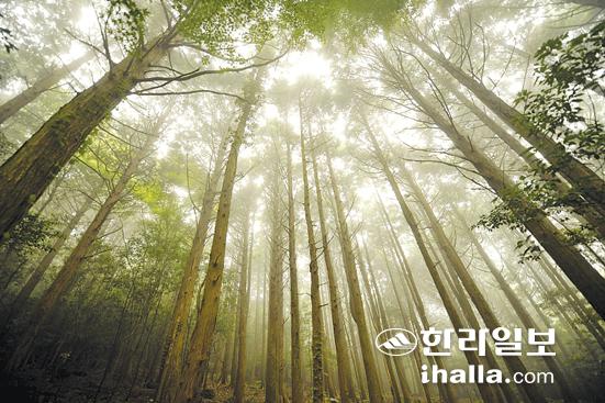 ▲시오름 북사면부터 시작되는 울창한 편백숲길은 제주시험림까지 벨트를 이루며, 시험림 경내에 들어서 효돈천을 낀 남성대 등반코스 제1대피소로 마무리 된다. /사진=강경민기자