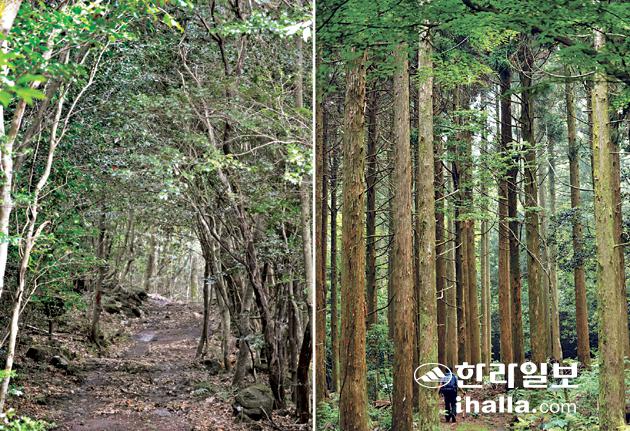 ▲제주도산악연맹과 한라일보가 공동 전개중인 '한라산 환상숲길' 탐사결과 1100도로변 서귀포휴양림에서 어점이악~효돈천 남성대 제1대피소~수악계곡~5·16도로변까지 20km를 연속해 이어진 동백나무 벨트를 확인했다.(사진 왼쪽) 사진 오른쪽은 환상숲길에서 만난 삼나무숲. /사진=강경민기자