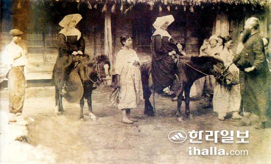성직자이자 제주식물에 관심을 보였던 프랑스 출신의 타케 신부는 20세기초 제주에 머물며 포교활동을 하는 동안 집중적으로 제주도의 식물을 채집한다. 그가 채집한 표본은 유럽 각국의 대학이나 박물관에 매각되거나 기증되면서 유럽의 학자들에 의해 발표되었다. 사진은 포교활동 당시의 타케신부(맨 오른쪽) /사진=한라일보 DB