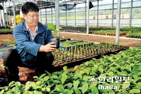 ▲방치되다시피한 황무지를 생태숲으로 되살린 주역중 한명인 한태완 연구사가 양묘하우스에서 키우고 있는 목련 묘목을 세심히 관찰하고 있다. /사진=강경민기자