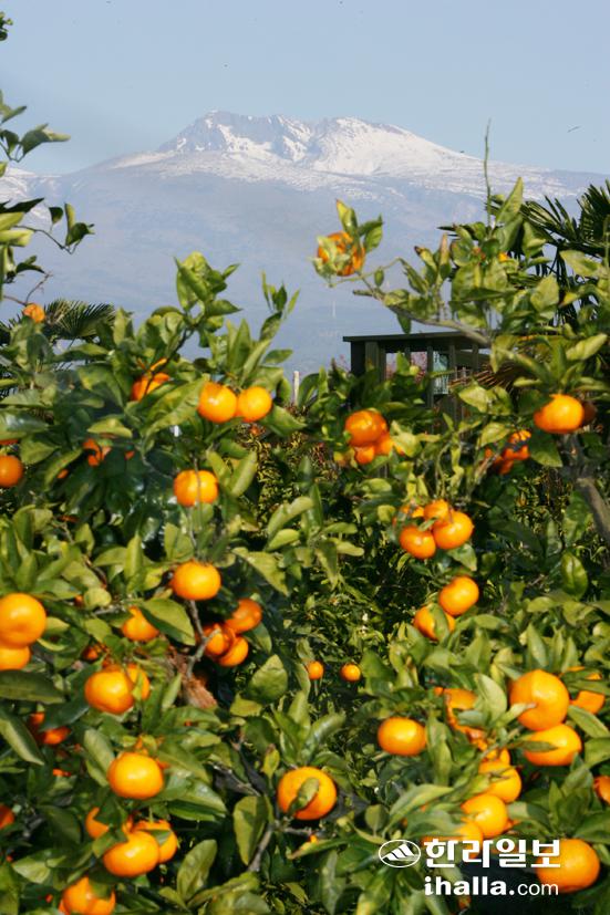 ▲수확기 제주 감귤원이 눈쌓인 한라산과 절묘한 조화를 이룬 경관이다. 제주감귤산업은 프랑스 신부 타케가 1911년 온주밀감을 도입한 이래 제주의 효자산업으로 성장해 왔다. 제주자치도는 제주감귤산업 100주년을 기념하는 사업을 대대적으로 전개할 계획이다. 독일 출신의 언론인이자 지질학자인 겐테는 20세기초 서양인으로는 최초로 한라산을 등정, 그 높이가 1950m라는 사실을 최초로 밝힌 인물이다. /사진=한라일보 DB