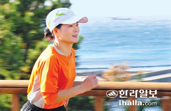 ▲김순자씨가 12일 중문관광단지에서 제주국제컨벤션센터로 이어지는 도로를 달리며 감귤마라톤을 준비하고 있다. /사진=이승철기자 sclee@hallailbo.co.kr