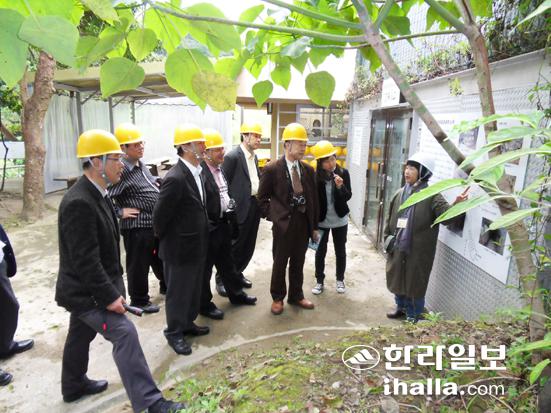 ▲제주도 참가자들이 하에바루전쟁유적 입구에서 현지 관계자로부터 설명을 듣고 있다. /사진=이윤형기자