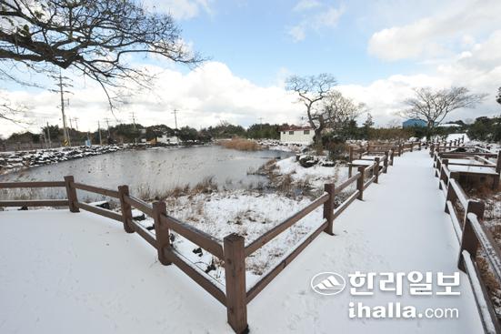 ▲마을의 대표적 습지로 꼽히는 눈쌓인 모산이물의 겨울 풍경.