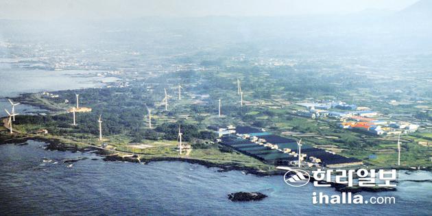 ▲제주시 구좌읍 행원리는 예전부터 국내 최대의 풍력발전단지가 들어선 풍차마을로 알려졌다. 유산마을로서의 핵심자원은 부족한 편이지만 세계자연유산 제주의 역사· 유배문화와 해양문화의 축소판인데다, 지질자원과 신재생에너지 관련까지 다양한 체험을 할 수 있는 마을이다. 사진은 하늘에서 바라본 행원마을 전경. /사진=한라일보 DB