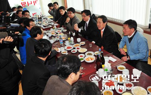 김태환 지사가 17일 낮 시내 한 식당에서 기자간담회를 갖고 지방선거 불출마에 대한 소견을 피력하고 있다. /사진=이승철기자