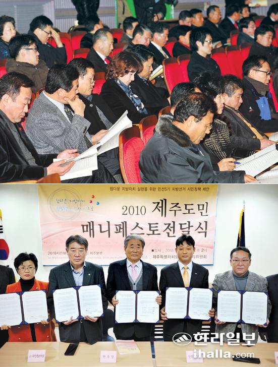 ▲김태환 제주도지사의 지방선거 불출마 선언으로 도지사 선거전은 예측불허의 정국이 전개되고 있다. 사진은 제주특별자치도선거관리위원회 주최 선거법 안내 설명회(사진 위)와 도내 정당 관계자와 시민사회단체 관계자 등이 참석한 가운데 열린 2010 제주도민 매니페스토 전달식. /사진=한라일보 DB