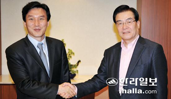 ▲민주당 지방선거기획본부장을 맡고 있는 김민석 최고위원은 26일 오후 제주KAL호텔에서 우근민 전지사를 만나 정식으로 복당을 요청했다. /사진=강희만기자