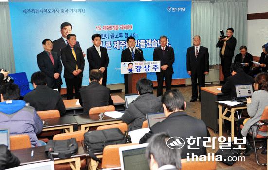 한나라당 강상주 전서귀포시장이 10일 도민의 방에서 기자회견을 갖고 다가오는 6월2일 지방선거 출마를 선언했다./사진=이승철기자