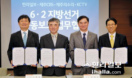 ▲한라일보사와 KCTV제주방송, 제주CBS, 제주의소리 등 언론 4사가 19일 제5회 전국동시지방선거를 앞두고 상호간 공동보도를 위한 업무협약을 체결했다. 사진 왼쪽부터 강만생 한라일보 사장, 고홍철 제주의소리 대표이사, 오창수 KCTV제주방송 사장, 김봉남 제주CBS 본부장. /사진=강희만기자 hmkang@hallailbo.co.kr