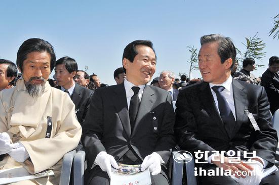 ▲3일 제주4·3평화공원에서 열린 4·3사건 희생자 위령제에 참석한 한나라당 정몽준 대표(사진 오른쪽부터)와 민주당 정세균 대표, 강기갑 민주노동당 대표가 이야기를 나누고 있다. /사진=강경민기자
