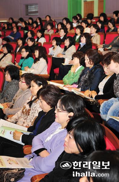 ▲지난 1일 제주학생문화원 소극장에서 열린 '2010년도 유치원 학급보조 자원봉사자 교육'에서 참가자들이 '집에서 엄마와 함께하는 NIE'의 실제 사례교육에 집중하고 있다. /사진=이현숙기자