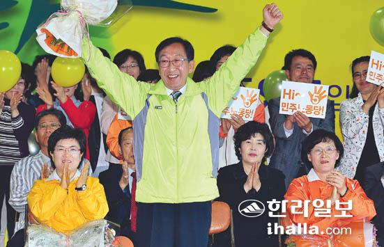 ▲10일 야권연대 도지사 후보로 추대된 민주당 고희범 예비후보가 결과 발표 후 현애자·오옥만 후보 등을 비롯한 참석자들로부터 축하박수를 받고 환호하고 있다. /사진=이승철기자 sclee@hallailbo.co.kr