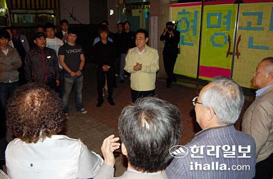 현명관 예비후보 지지자들이 12일 저녁 현 후보의 자택 앞에서 지방선거 출마를 촉구하고 있다.