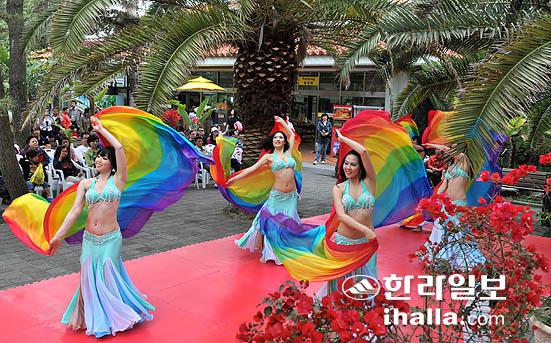 15일 '2010 찾아가는 문화활동'의 일환인 제주헤라스밸리댄스 공연이 제주시 한림공원에서 화려하게 펼쳐져 관광객들의 시선을 사로잡고 있다./사진= 강경민기자