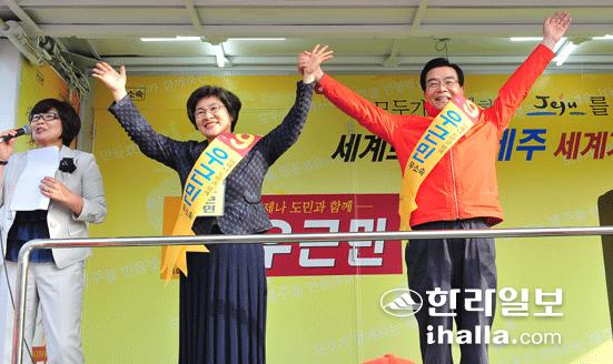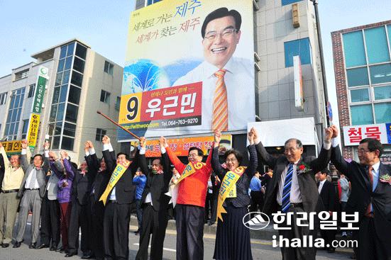 우 후보는 또 "누가나 가보지 않은 길은 두려워한다. 저는 제주가 아직 가보지 않았던 일들을 약속하겠다"며 "수출 1조원시대를 열고, 해외관광객 200만명을 유치하고, 제주를 동아시아 식품가공무역의 메카로 키우겠다"고 약속했다.