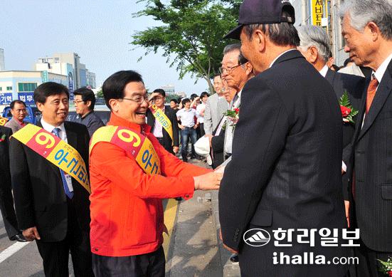 ▲우근민 무소속 제주도지사 후보가 20일 오후 서귀포시선거연락소 출정식을 가진 뒤 지지자들을 만나 악수하고 있다. /사진=이승철기자