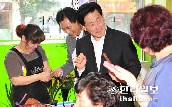 ▲양성언 교육감 후보가 31일 서귀포시 중문지역을 찾아 지지를 호소하고 있다. /사진=강희만기자