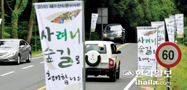 ▲올해로 2회째를 맞은 '사려니 숲길 걷기'행사가 12일 오전 개막돼 27일까지 열린다. 사려니 숲길은 5·16도로변 제주시 조천읍 교래리 비자림로 물찻오름 입구에서 남원 한남리 사려니오름까지 약 16km 이어지는 임도에서 만날 수 있다. 사진은 숲길로 향하는 도로변에 행사를 알리는 홍보용 배너. /사진=강경민기자 gmkang@hallailbo.co.kr