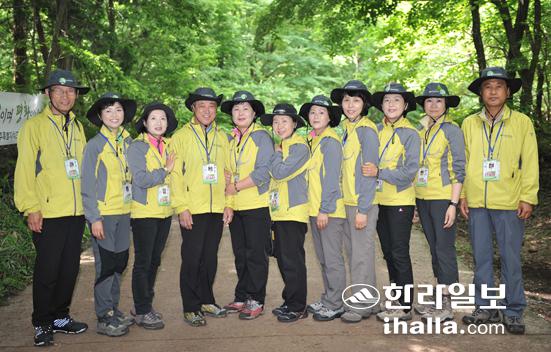 ▲2010 제주산림문화체험 제2회 사려니숲길 걷기 행사의 숨은 주역들이자 '숲 예찬론자'들인 숲 해설사들이 22일 사려니숲길 입구에서 기념촬영을 하고 있다. /사진=강희만기자
