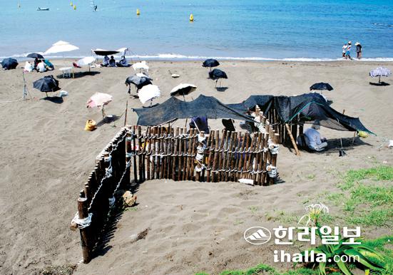 ▲모래유실은 남원읍 신례2리 공천포 해수욕장만의 고민이 아닐 것이다. 공천포처럼 검은모래로 유명한 제주시 삼양검은모래해변에 설치된 모래포집기.