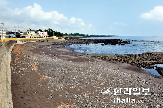 ▲최근에 찾은 서귀포시 남원읍 신례2리 공천포 해수욕장. 80년대 이후 한층 심각해진 모래유실로 이대로가면 조만간 모래바닥이 완전히 드러날 처지에 놓여있다. /사진=강경민기자
