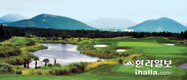 ▲유러피언 한국여자 마스터즈 대회코스였던 사이프러스골프장 8번홀은 오름 자락 아래 연못이 펼쳐진 풍경으로 이국적 정취를 자아내고 있다. /사진=강희만기자 hmkang@hallailbo.co.kr