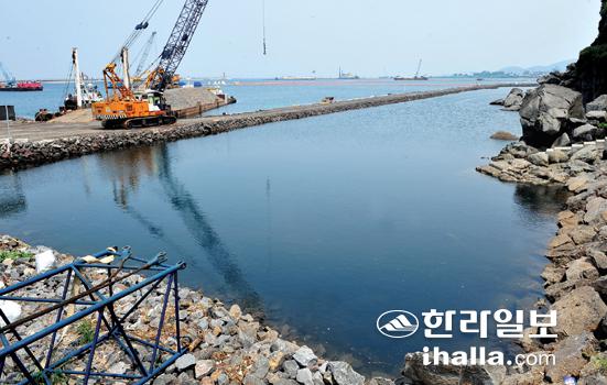 ▲제주외항 제2단계 공사가 진행되고 있는 제주시 동부두 진입로 옆 해녀대합실 앞 바다가 심각한 오염으로 해조·어패류가 자취를 감추는 등 피해가 발생, 대책마련이 시급하다는 지적이다. /사진=이승철기자 sclee@hallailbo.co.kr