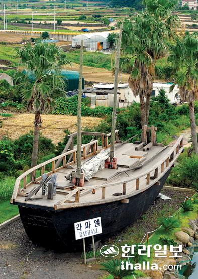 차귀도가 눈앞에 걸리는 그곳에 배 한척이 놓여있었다. 라파엘호다. 우리나라 최초의 사제인 김대건 신부가 중국 상하이항을 출발해 서해 바닷길로 귀국하다 제주에 표착할 당시 탔던 배를 복원해놓은 것이다. 라파엘호는 지금 제주시 한경면 용수리 '성 김대건 신부 제주표착 기념관' 야외에 전시되어 있다.