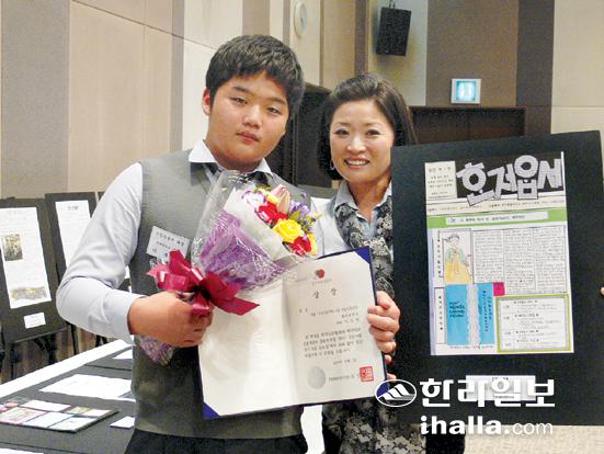 ▲2010 대한민국 NIE 공모전에서 신문만들기 부문 중등부 대상을 수상한 이수빈군과 어머니 김향란씨. 제주에서 전국 NIE대회 대상을 받은 것은 이번이 처음이다. /사진=이현숙기자