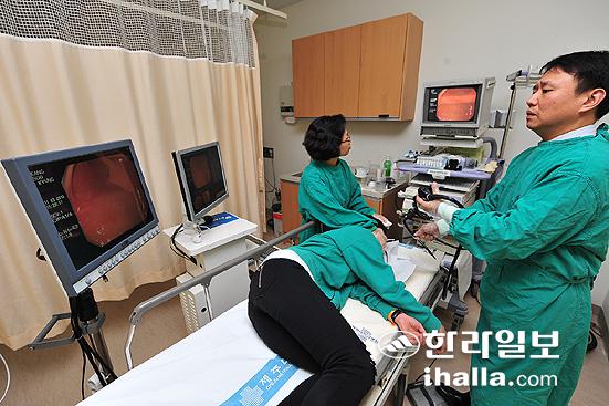 ▲세균이나 이물질이 체내로 들어오거나 접촉하게 되면 스스로 보호하기 위해 인체가 나타내는 반응을 염증이라고 한다. 위 사진은 제주대학교 소화기내과 김흥업 교수가 위내시경을 촬영을 하고 있는 장면이다. /사진=이승철기자