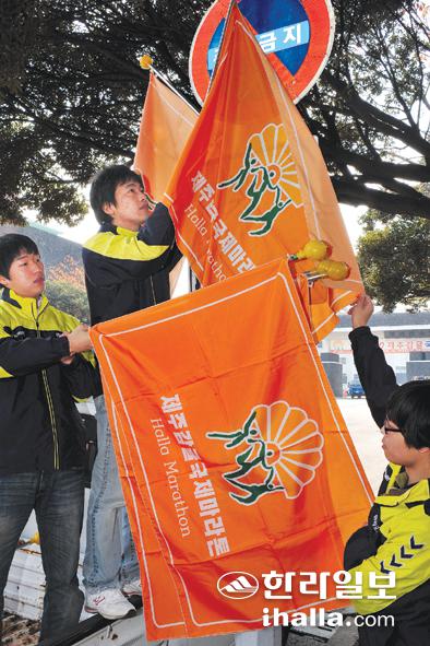 2010제주감귤국제마라톤대회 D-2를 맞아 분위기가 고조되고 있다. 19일 대회 관계자들이 주요 도로에서 대회를 알리는 배너기를 달고 있다. /사진=강경민기자