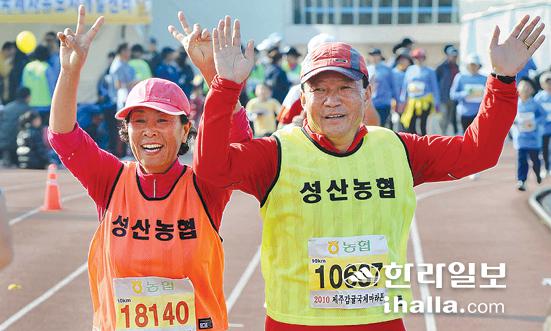▲10km를 완주한 현용행 성산농협조합장(오른쪽)과 암을 이겨내는 부인 강대여씨.