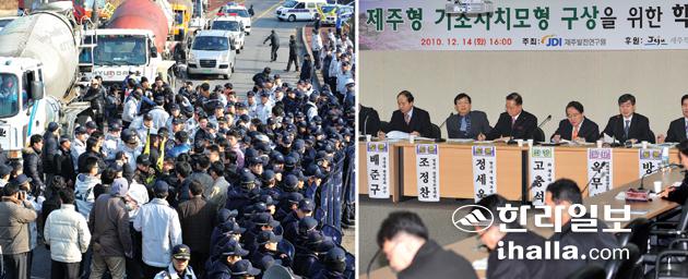 ▲해군기지 문제는 다시 원점으로 회귀했고 제주자치도형 기초자치단체 도입도 위헌 소지 논란과 함께 도민 공감대를 얻어낼 수 있을지 의문시되고 있다.