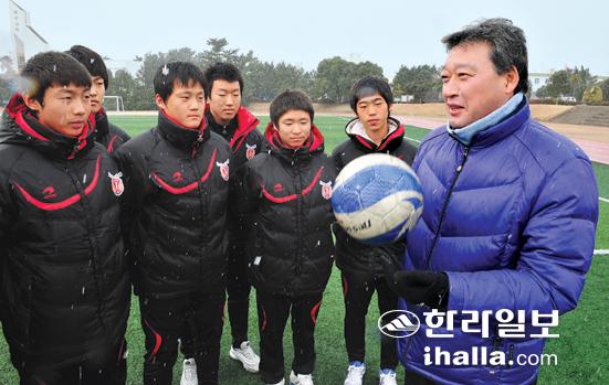 ▲설동식 서귀포고 축구감독이 눈이 오는 궂은날임에도 선수들과 훈련을 하고 있다. 설 감독은 육지부 축구팀을 서귀포로 초청, 연습게임을 하면서 ‘제주=전지훈련 메카’를 다지는 디딤돌 역할을 했다는 평가를 받고 있다. /사진=강경민기자