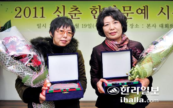 ▲2011 신춘한라문예 시상식이 19일 오후 한라일보사 4층 대회의실에서 열려 시 부문 당선자인 고경숙씨(사진 오른쪽)와 소설부문 당선자인 오미향씨에게 상금과 상패를 전달했다. /사진=강경민기자