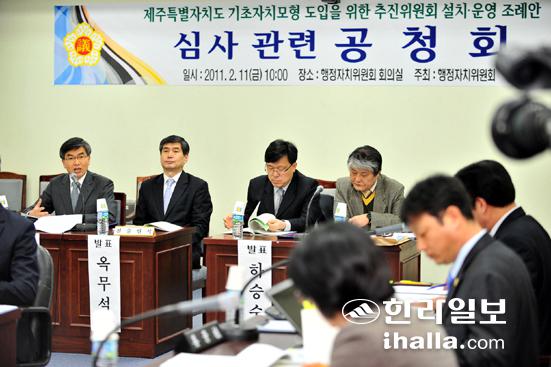 ▲11일 '제주형 기초자치모형 도입을 위한 추진위원회 설치조례안' 심사를 위해 제주자치도의회 행정자치위원회가 마련한 공청회에서 찬반토론자 사이 '제주형 자치행정모형'과 관련 직선단체장의 권한과 기초자치권 부활을 놓고 논쟁이 벌어졌다. /사진=강경민기자