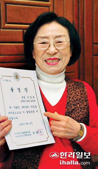 ▲여든한살의 김영희 할머니가 방송통신고등학교 졸업장을 들어보이며 당시의 추억을 이야기하고 있다. /사진=이승철기자