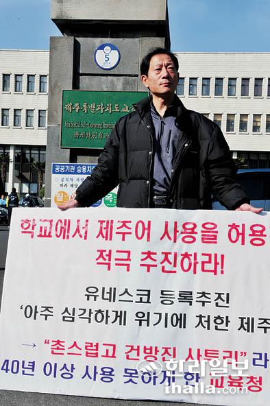 제주 사투리는 박물관에 보관하여 가끔 꺼내 보는 것이 좋을 듯. 언어는 시대에 따라가야 하는데.. 지금 육지 가서 제주사투리 하면 놀림감 밖에 안 되지. 학교에선 당연히 표준말 가르치는 게 맞다. 봐라 데모하는 저 자도 표준말로 된 간판 쳐 들고 있잖아. 유네스코에서 뭐라했는지 모르나 거기서 우릴 책임 지는 것 아니짢아. |