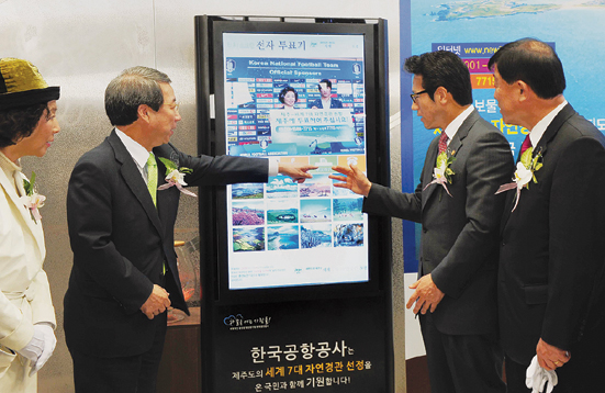 ▲제주 -세계 7대 자연경관 선정 범국민추진위원회 정운찬 위원장(왼쪽 두번째)과 정병국 문화관광부장관(오른쪽 두번째)이 지난 18일 김포공항 국내선 3층 출발장에 설치된 전자투표기에서 투표시범을 보이고 있다. 뉴시스
