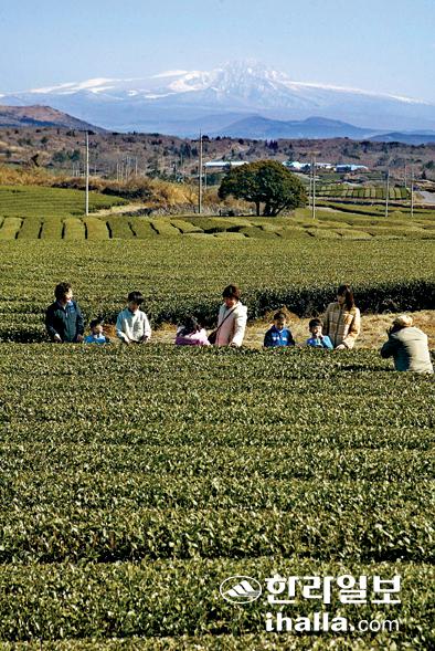 ▲2코스에 포함된 녹차밭 전경. 멀리 눈이 녹지 않은 한라산이 보인다.