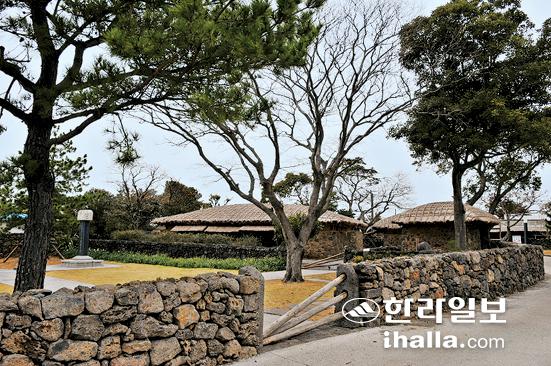 ▲추사적거지 전경. 초가를 둘러싼 돌담 중앙에 정낭이 자리잡고 있다.