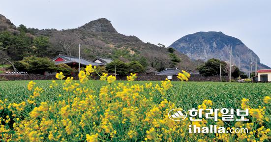 ▲바람따라 길을 돌아 대정향교로 향한다. 좁게 난 길을 따라 걸으며 추사는 무슨 생각을 했을까. 추사가 떠난 길엔 봄꽃이 흐드러지게 피어 있다. 향교 너머로 산방산도 보인다. /사진=강경민기자