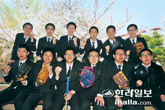 ▲제주일고 야구 동아리 '나이스캐치'의 2~3학년 학생들이 연분홍 벚꽃 날리는 교정에서 포즈를 취했다. /사진=강경민기자
